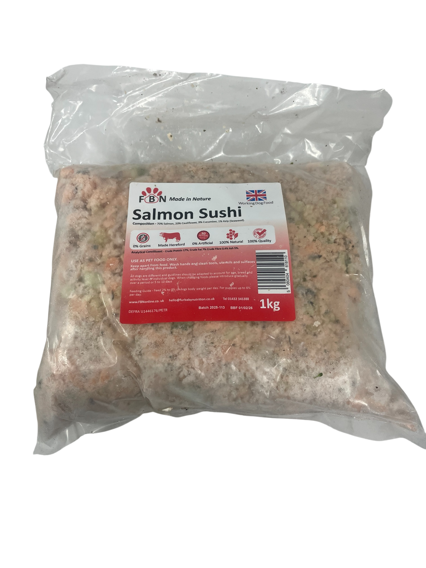 Made with 100% Salmon Fillet, Cauliflower Rice (Not actually rice) Cucumber and Seaweed, our Salmon Sushi has a great texture that dogs love, super fresh made from frozen material not defrosted ensures our salmon smells great, tastes great, looks great.