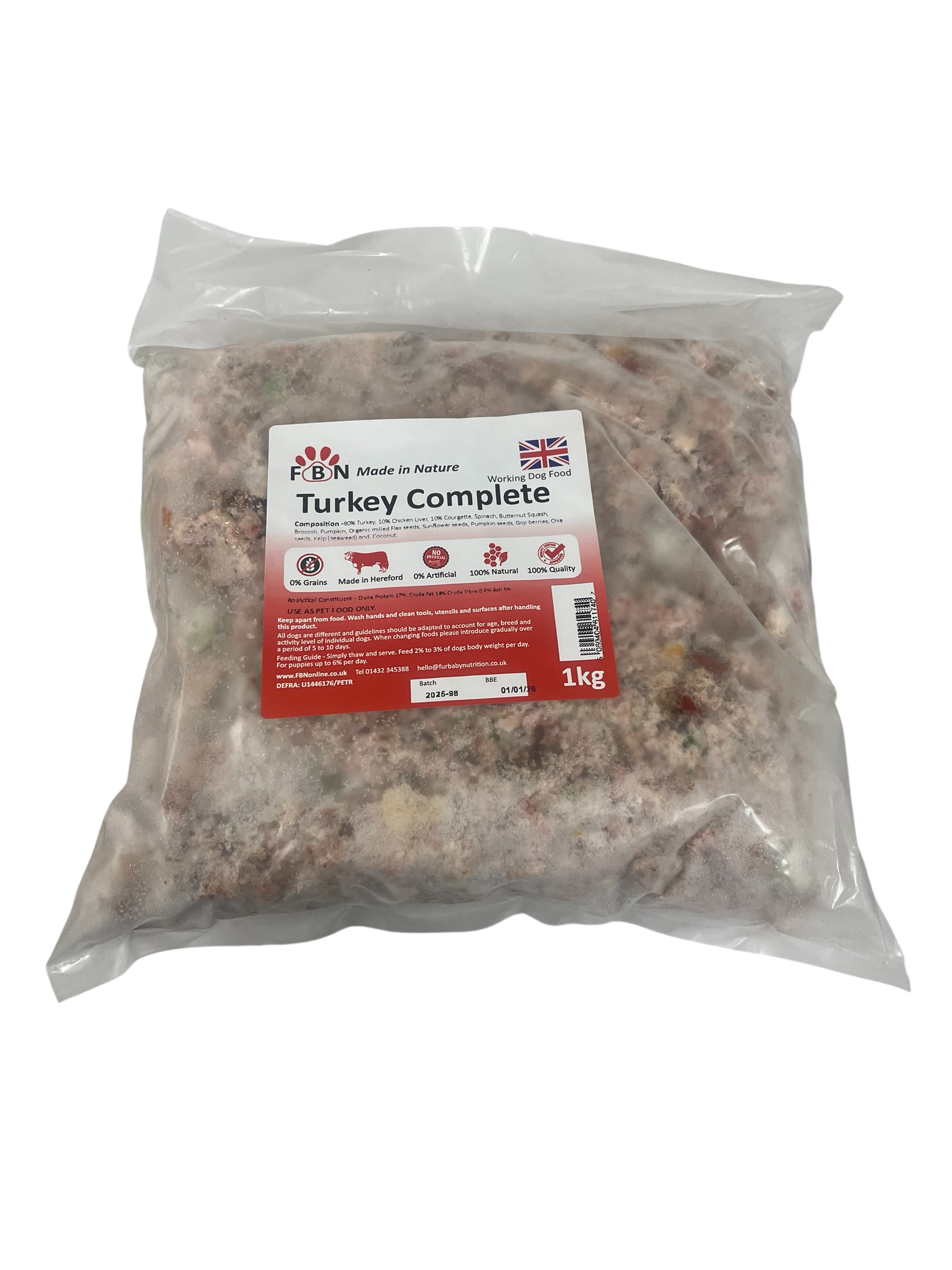 Made with 100% Turkey, Chicken Liver, 5 vegetables and 7 botanicals and nothing else, our Turkey Complete has a great texture that dogs love, super fresh made from frozen material not defrosted ensures our turkey smells great, tastes great, looks great.
