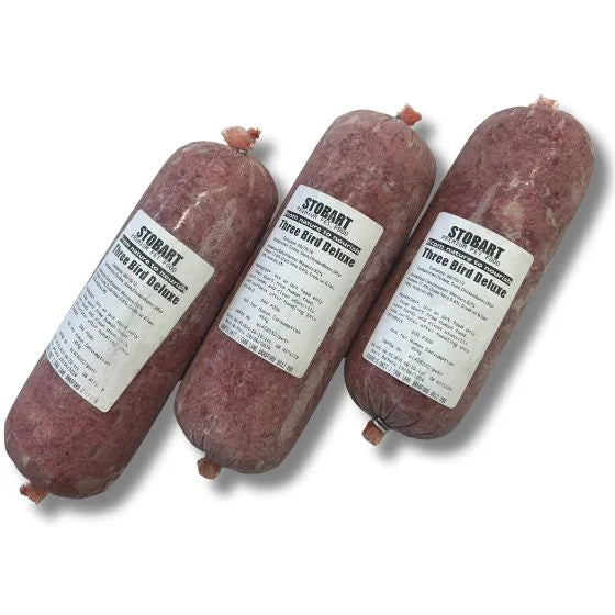 Stobart Three Bird Deluxe Complete is minced to 80:10:10, with 80% turkey, duck and chicken cuts, 10% bone and 10% offal.